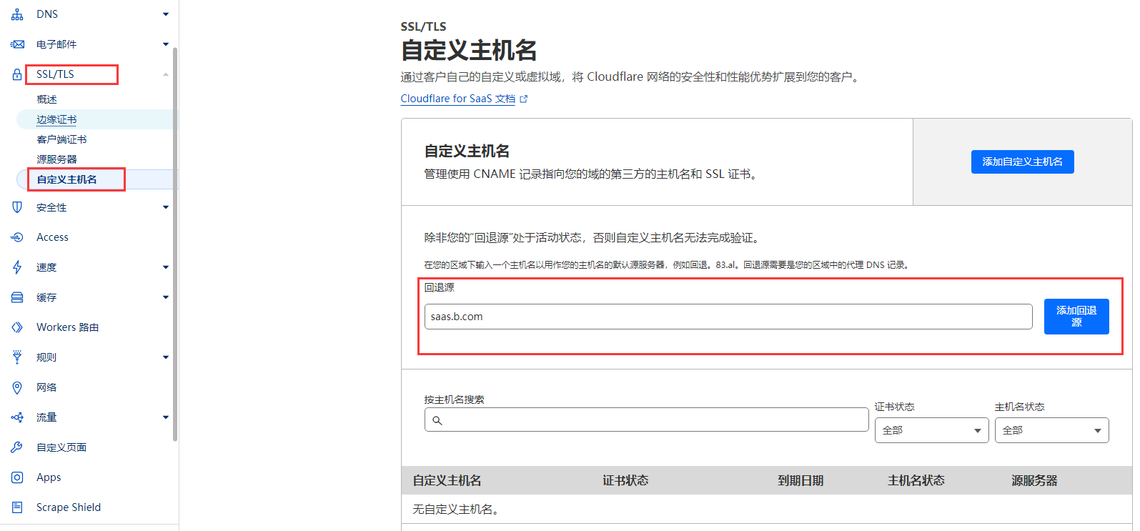 - 然后在 CloudFlare 中配置退回源地址 `saas.b.com`