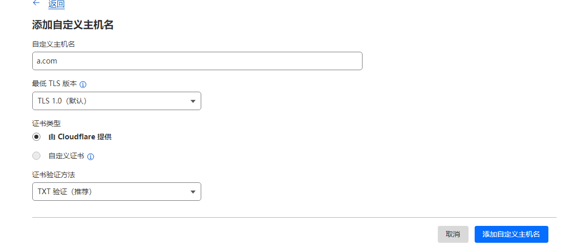 - 在阿里云开启云解析,添加一个子域名(例如:a.a.com),并在CloudFlare中进行TXT验证。